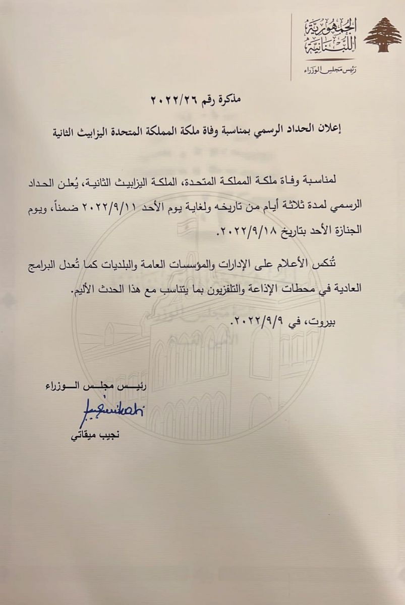 ونشرت الصفحة الرسمية لحكومة تصريف الأعمال في لبنان، على تويتر، مذكرة مفادها إعلان الحداد، الرسمي بمناسبة وفاة ملكة المملكة المتحدة.