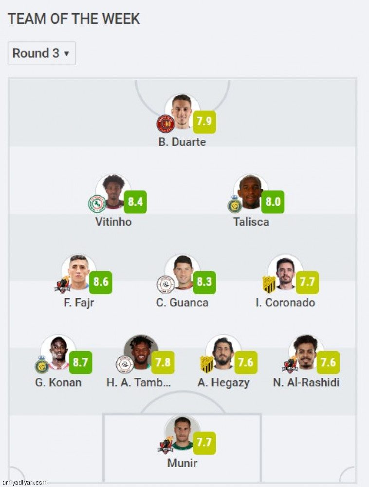 وفقًا لموقع سوفا سكور العالمي المهتم بالأرقام والإحصاءات العالميه ، على تتويج الإيفواري جيسلان كونان، لاعب فريق النصر الأول لكرة القدم، على التقييم الأعلى في الجولة الثالثة لدوري روشن السعودي .