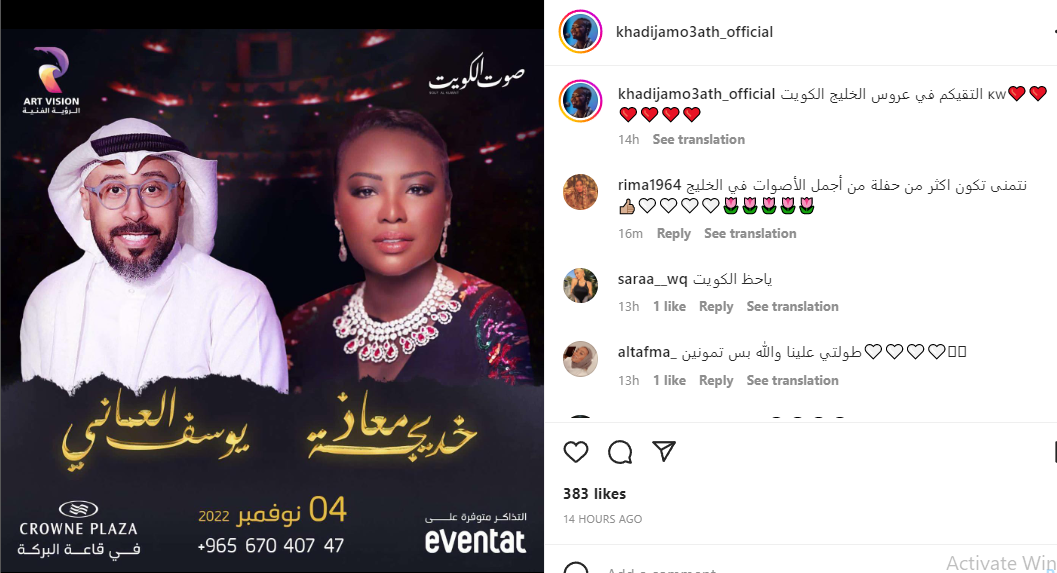 وشاركت الفنانة السعودية خديجة معاذ متابعيها صورة بموعد حفلها الجديد في دولة الكويت، المقام ضمن برنامج الرؤية الفنية صوت الكويت، عبر حسابها الرسمي على موقع تبادل الصور والفيديوهات الشهير "انستجرام".