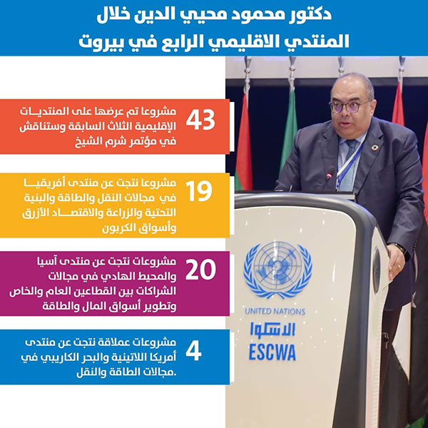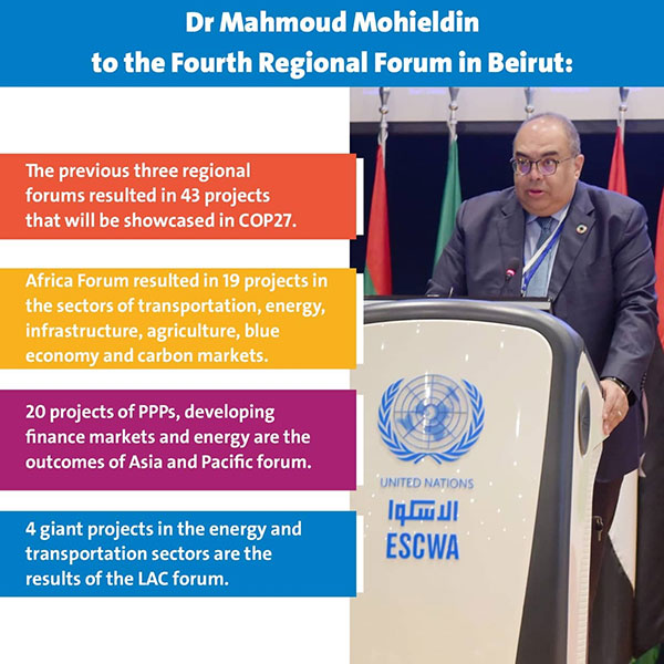وأفاد بأن نتائج المنتديات الإقليمية الثلاثة التي سبقت منتدى بيروت تؤكد أهمية البعد الإقليمي للعمل المناخي، وضرورة العمل المشترك بين دول الإقليم الواحد للتعرف على نقاط التكامل والعمل عليها، موضحاً أن منتدى أفريقيا أسفر عن 19  مشروعاً تنموياً قابلاً للتنفيذ في مجالات النقل والطاقة والبنية التحتية والزراعة والاقتصاد الأزرق وأسواق الكربون.