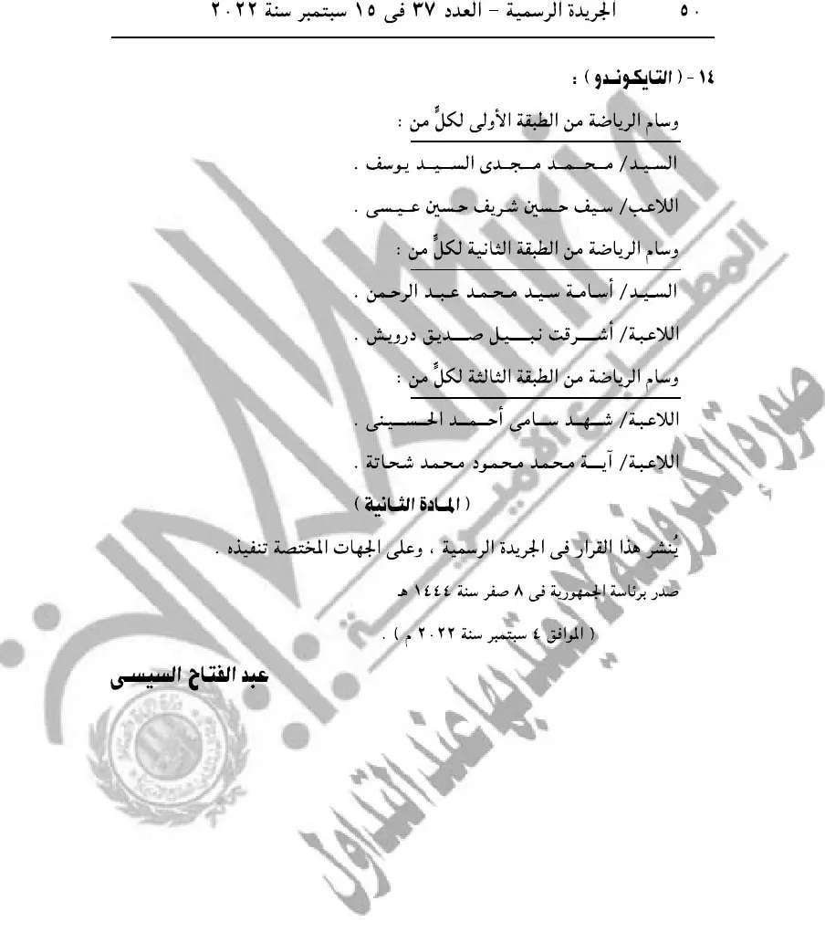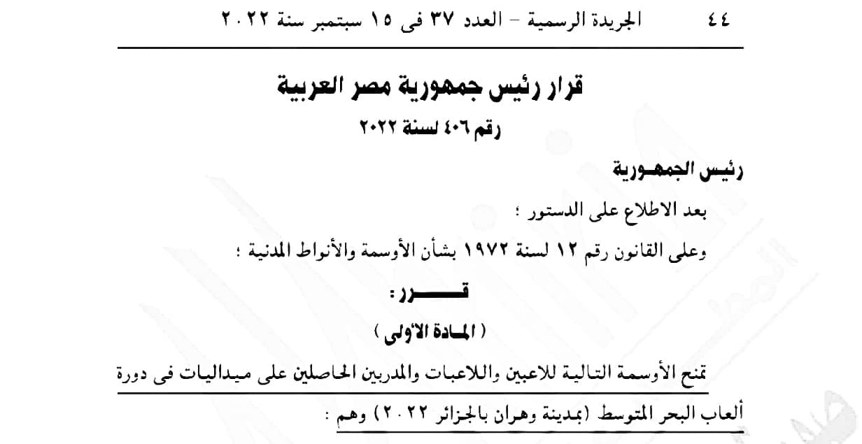 أصدر السيد الرئيس عبدالفتاح السيسى رئيس الجمهـورية القرار الجمهورى رقم 406 لسنة 2022 المتضمن فى مادته الأولى منح وسام الرياضة من الطبقة الاولي والثانية والثالثة لأبطال ومدربا منتخب مصر الأول للتايكوندو أصحاب الانجاز التاريخي للتايكوندو المصري في دورة العاب البحر المتوسط بوهران والتي اقيمت خلال الفترة من 25 يونيو الي 6 يوليو الماضي.