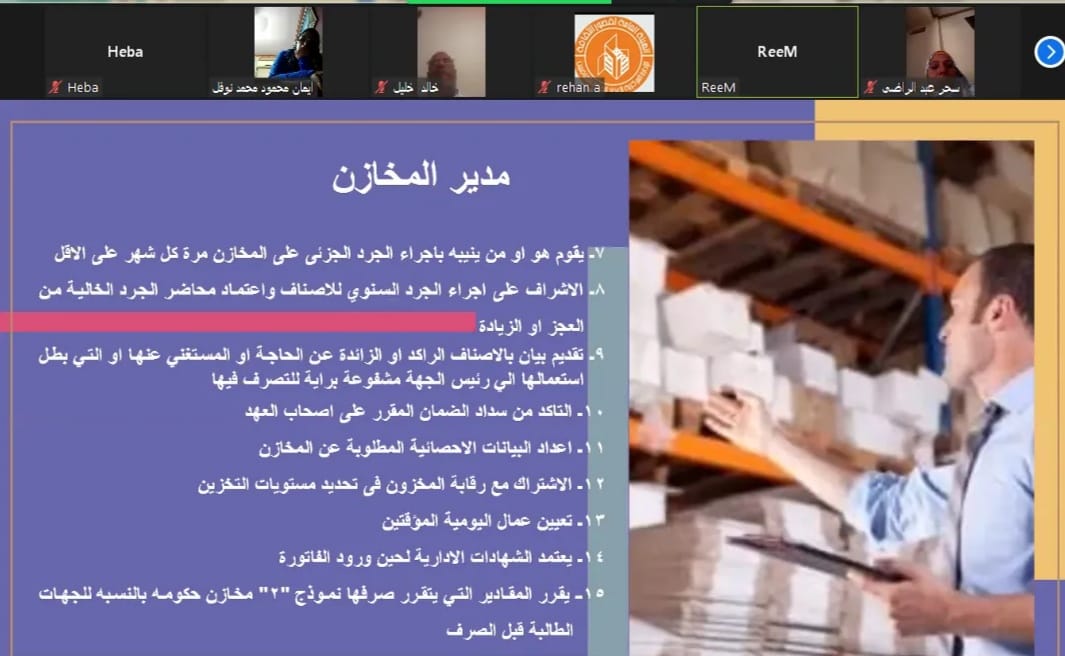 بدأت أولى محاضرات اللقاء مع أ. ريم إبراهيم حسن مدير عام الإدارة العامة لمكتب رئيس الهيئة العامة للخدمات الحكومية مشيرة إلى أن إدارة المخازن في تطور، وتحديث مستمر لما لها من أهمية بالغة تُسخر لها كافة التقنيات التكنولوجيا الحديثة من أجل الرقى بطرق إدارة المخازن وذلك لإدارتها بأقصى دقة ممكنة في أسرع وقت وبأقل مجهود وتعتبر هذه هي المعادلة الصعبة التي يجب أن تتحقق ، بإدارة المخازن متنوعة سواء اليدوية التقليدية، أو الحديثة