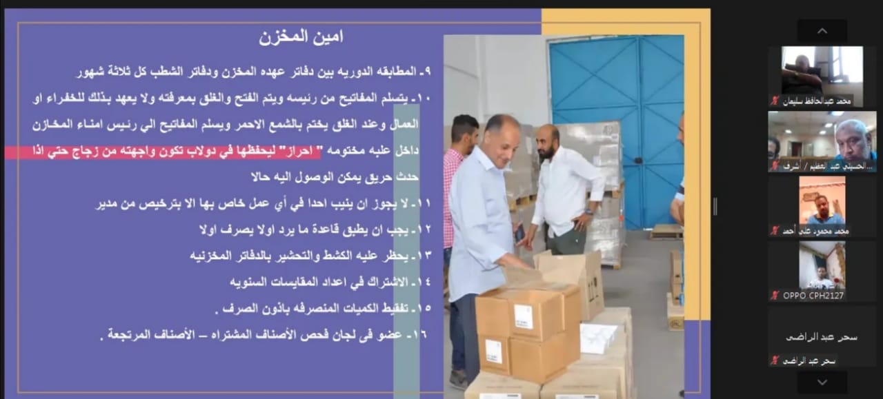 وتناولت بالشرح والتوضيح الدورة المستندية في المخازن وعمليات الفحص والاستلام والصرف والارتجاع ، وأنواع الجرد وإجراءاته والتسويات الجردية وكيفية التعامل مع الفاقد والتالف والراكد من المواد بالمخازن أو بالعهدة .