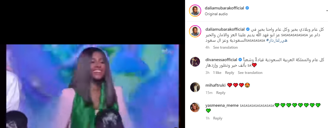 وعلقت الفنانة داليا مبارك على الفيديو قائلة: "كل عام وبلادي بخير وكل عام وإحنا بخير في عز أبو فهد، الله يديم علينا العز والأمان والخير .. هى لنا دار.. السعودية وعز السعود.