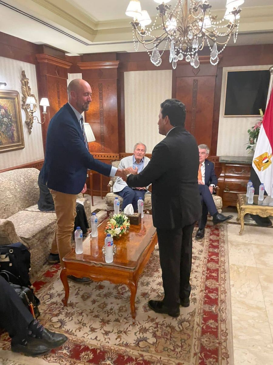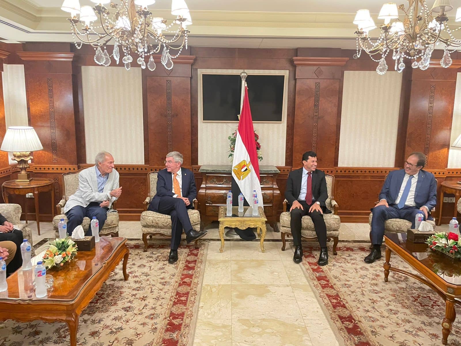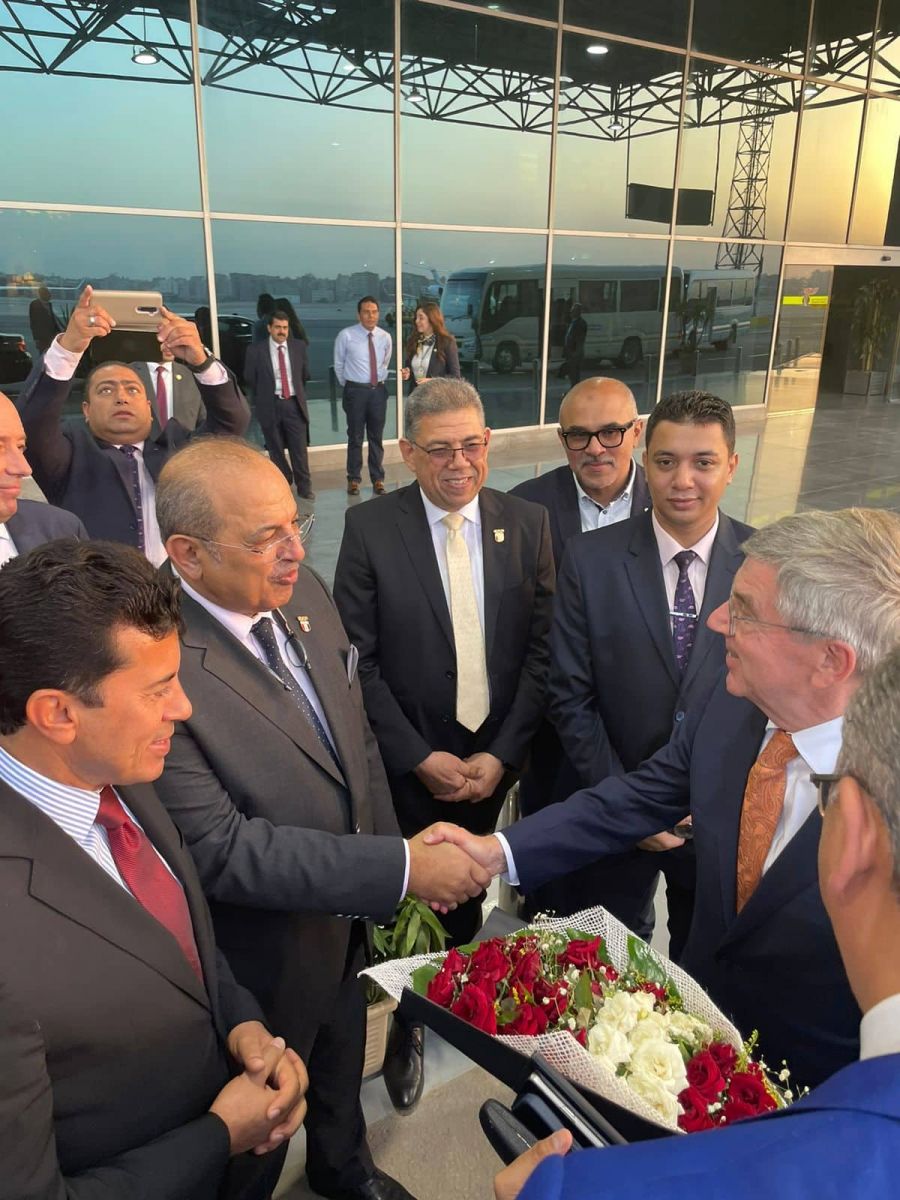 وعقب وصوله، عقد وزير الشباب والرياضة جلسه مع رئيس اللجنة الأولمبية الدولية بمطار القاهرة الدولي بحضور والدكتور حسن مصطفى رئيس الاتحاد الدولي لكرة اليد والمهندس هشام حطب رئيس اللجنة الأولمبية المصرية، رحب خلالها برئيس اللجنة الأولمبية الدولية للقاهرة، وحرصه الدائم علي دعم الرياضة المصرية، وإشادته المستمرة بالبنية الرياضية المصرية عقب استضافة العديد من البطولات العالمية في ظل انتشار جائحة كورونا، وتقديم الدعم والمساندة لكافة الاتحادات المصرية.