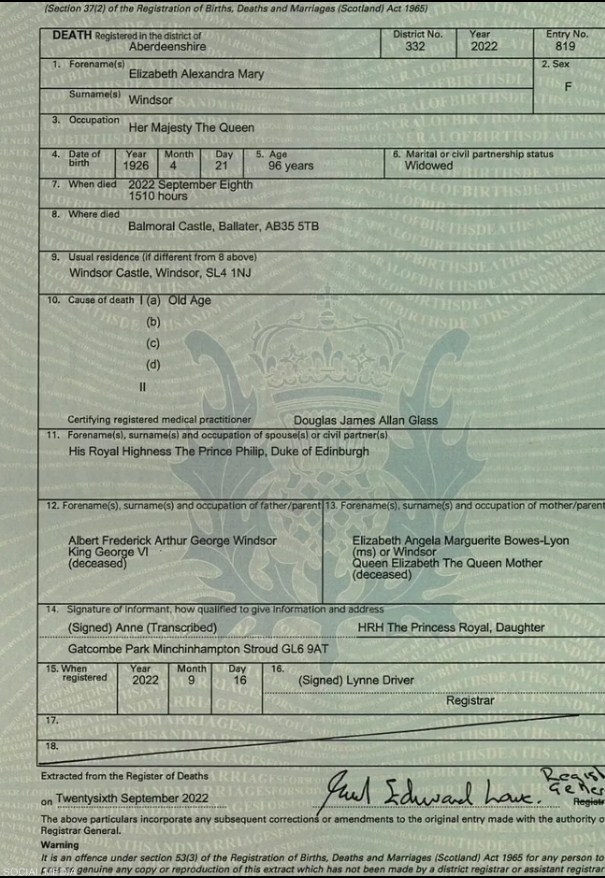 وبعد مرور 10 أيام على جنازة الملكة، نشر الموقع الرسمي لـ"المحفوظات الوطنية في اسكتلندا"، اليوم شهادة وفاة الملكة إليزابيث الثانية، وجاء فيها.
