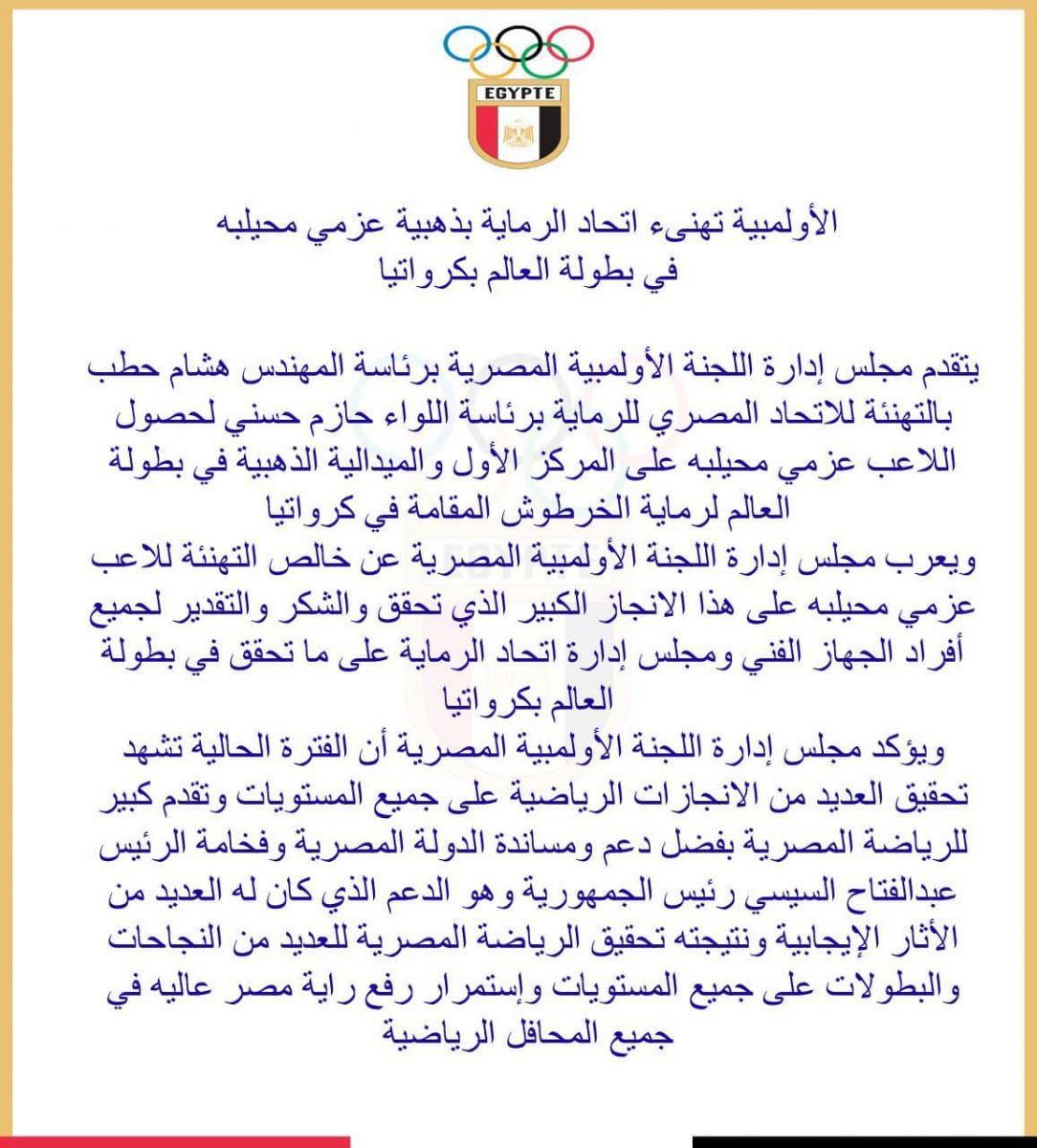 تقدم مجلس إدارة اللجنة الأولمبية المصرية برئاسة المهندس هشام حطب بالتهنئة للاتحاد المصري للرماية برئاسة اللواء حازم حسني لحصول اللاعب عزمي محيلبه على المركز الأول والميدالية الذهبية في بطولة العالم لرماية الخرطوش المقامة في كرواتيا.