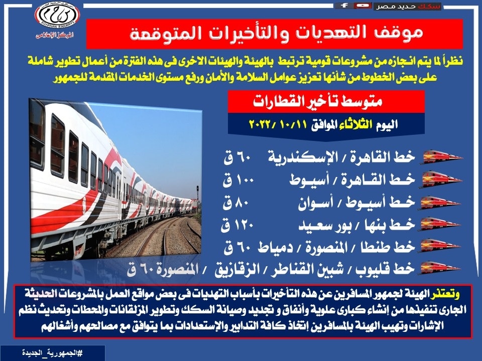 واعتذرت الهيئة لجمهور المسافرين عن هذه التأخيرات بسبب التهديات في بعض مواقع العمل بالمشروعات الحديثة الجاري تنفيذها من تجديد وصيانة السكك، وتطوير المزلقانات والمحطات وتحديث نظم الإشارات.