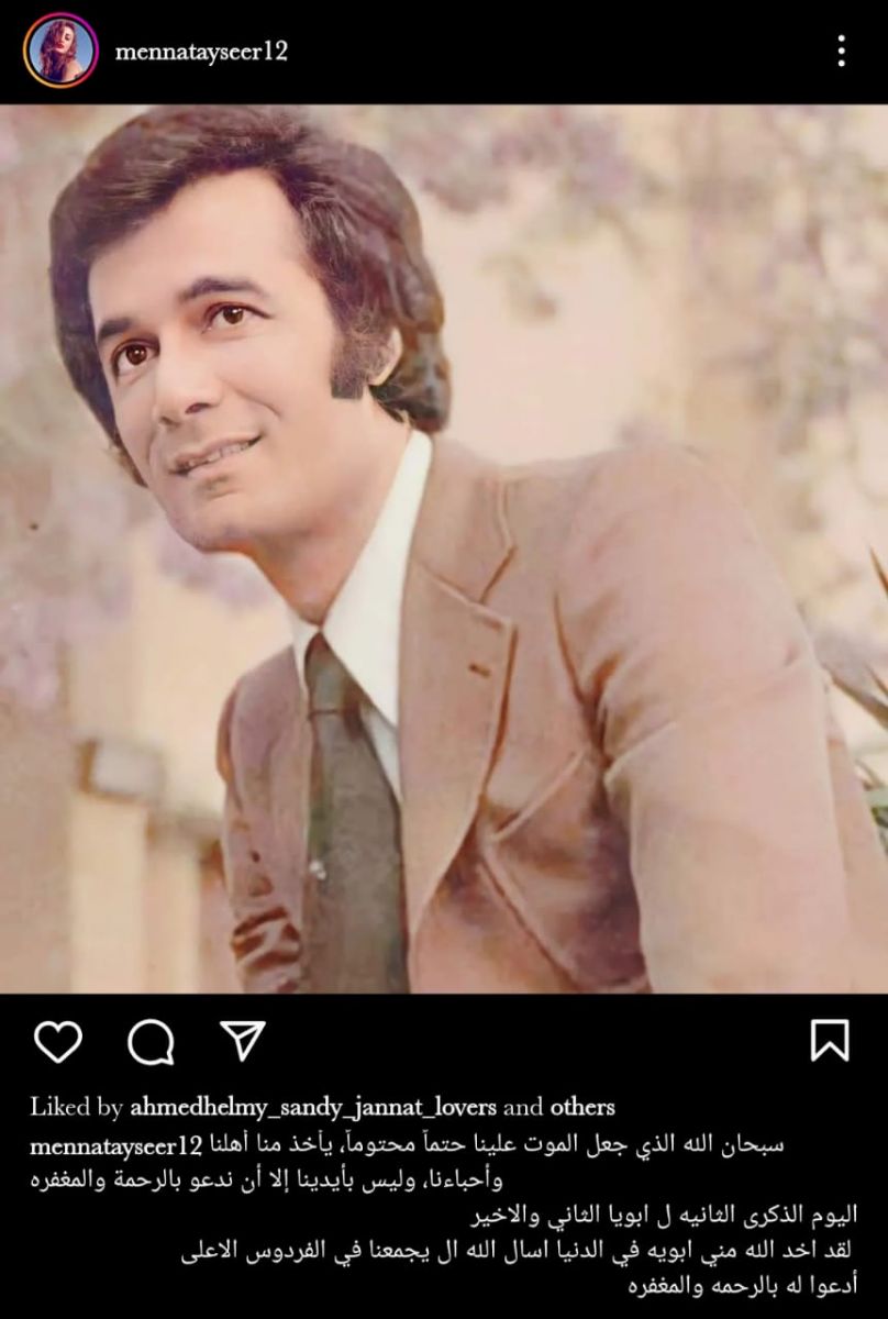 ونشرت "منه" صورة للفنان الراحل وعلقت عليها قائلة: "سبحان الذي جعل الموت علينا حتماً محتموماً، يأخذ منا أهلنا وأحباءنا، وليس بأيدينا إلا أن ندعو بالرحمة والمغفرة، اليوم الذكري الثانيه لـ أبويا الثاني والأخير".