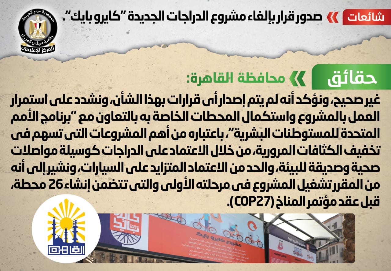 قام المركز الإعلامي لمجلس الوزراء بالتواصل مع محافظة القاهرة، والتي نفت تلك الأنباء، مُؤكدةً أنه لا صحة لإلغاء مشروع الدراجات الجديدة "كايرو بايك"، وأنه لم يتم إصدار أي قرارات بهذا الشأن، مُشددةً على استمرار العمل بالمشروع واستكمال المحطات الخاصة به بالتعاون مع "برنامج الأمم المتحدة للمستوطنات البشرية"، باعتباره من أهم المشروعات التي تسهم في تخفيف الكثافات المرورية، من خلال الاعتماد على الدراجات كوسيلة مواصلات صحية وصديقة للبيئة، والحد من الاعتماد المتزايد على السيارات، مُشيرةً إلى أنه من المقرر تشغيل المشروع في مرحلته الأولى والتي تتضمن إنشاء 26 محطة، قبل عقد مؤتمر المناخ (COP27).