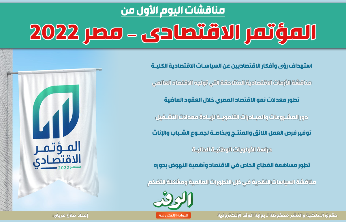 تنطلق غدا فعاليات "المؤتمر الاقتصادي - مصر 2022"، الذي تنظمه الحكومة المصرية خلال الفترة من 23 إلى 25 أكتوبر الجاري؛ لمناقشة أوضاع الاقتصاد المصري ومستقبله، وذلك بمشاركة واسعة من كِبار الاقتصاديين، والمفكرين، والخبراء المتخصصين.