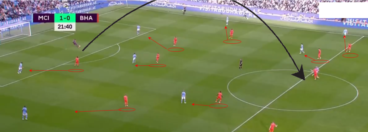 وقرر بيب جوارديولا منح حارسه البرازيلي دورًا تكتيكيًا مهمًا في مباراة مانشستر سيتي وبرايتون عن طريق التقدم بالكرة عدة خطوات ليصبح أحد لاعبي خط الدفاع المكون من 4 لاعبين بتواجد لابورت وأكانجي على الأطراف ودياز وإيدرسون في العمق مع تقدم الظهير الأيسر كانسيلو للأمام.