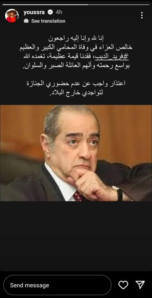 وكتبت يسرا قائلة: "إنا لله وإنا إليه راجعون".. خالص العزاء في وفاة المحامي الكبير والعظيم فريد الديب فقدنا قيمة عظيمة تغمده الله بواسع رحمته وألهم العائلة الصبر والسلوان".