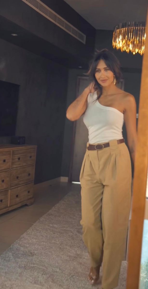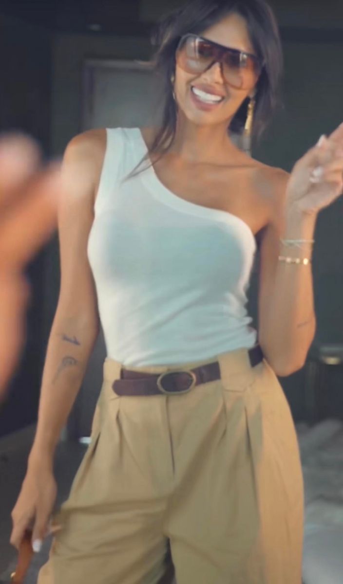 وبدت إنجي ببنطال فضفاض باللون الجملي، ونسقت معه توب أبيض مُجسم، بصيحة الكتف الواحد، ومكشوف الظهر، وحددت خصرها بحزام جلد باللون البني، ونسقت معه حقيبة جلد بدرجات البني صغيرة الحجم، وانتعلت حذاء ذا كعب عالٍ باللون الأبيض الشفاف.