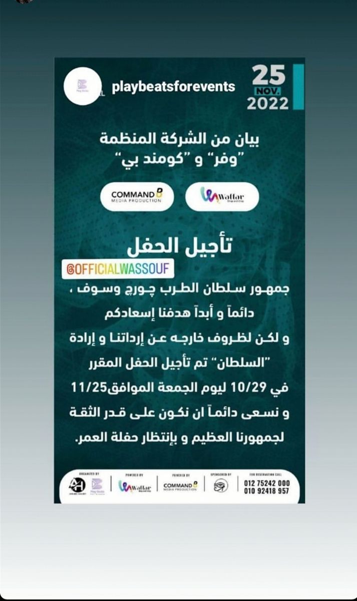 على جانب آخر اعلن ابو وديع  منذ قليل عبر ستورى على صفحته بموقع التواصل الإجتماعي "انستجرام"  عن قرار تأجيل الحفل وتحديد الموعد الجديد له واختتم قائلا: "نسعى دائما أن نكون على قدر الثقة لجمهورنا العظيم وبانتظار حفلة العمر".