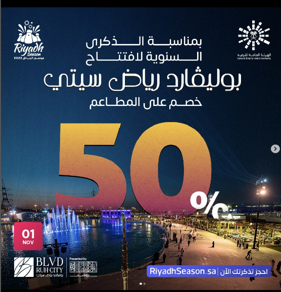 تعلن منطقة البوليفارد رياض سيتي عن خصومات 50%، على المطاعم والمقاهي، بمناسبة الذكرى السنوية لإفتتاح البوليفارد رياض سيتي في المملكة العربية السعودية، وذلك ضمن فعاليات موسم الرياض 2022، المقام برعاية الهيئة العامة للترفيه، والذي يضم عددًا من البرامج الغنائية والترفية داخل المملكة.