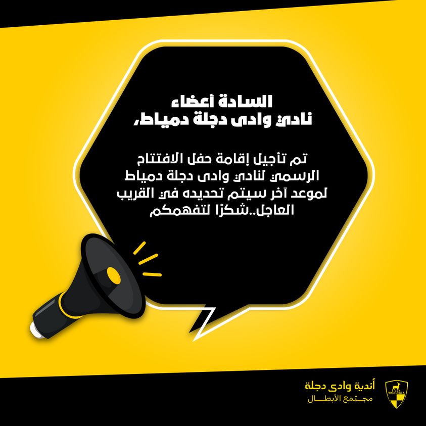 جاء بيان التأجيل، كالآتي: "تم تأجيل إقامة حفل الافتتاح الرسمي لنادي وادى دجلة دمياط لموعد آخر سيتم تحديده في القريب العاجل. شكرًا لتفهمكم، وكان من المفترض إقامته غدًا الجمعة ضمن جولات حماقي الغنائية في شتاء 2022