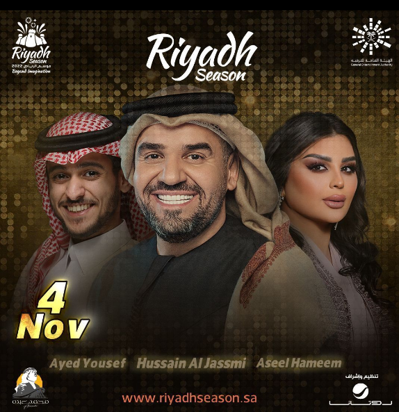 ومن المقرر أن يقام الحفل اليوم، بمشاركة الفنان عايض يوسف، والنجم حسين الجسمي، على مسرح محمد عبده أرينا، داخل بوليفارد رياض ستي.