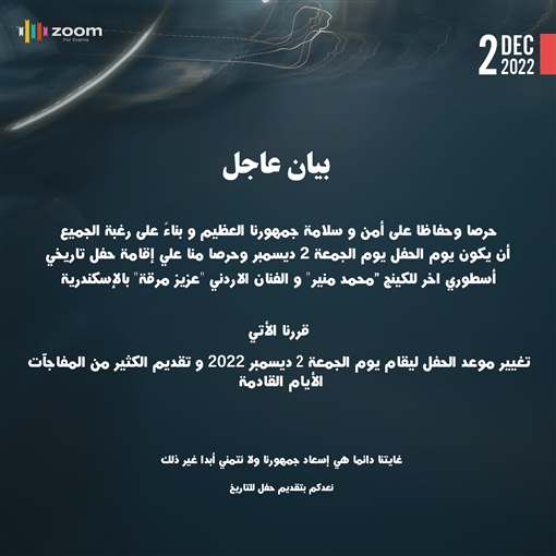 وتابع: "قررنا الأتي تغيير موعد الحفل ليقام يوم الجمعة 2 ديسمبر 2022 ونعدكم بتقديم حفل للتاريخ وتقديم الكثير من المفاجآت الأيام القادمة وغايتنا دائماً هي إسعاد جمهورنا ولا نتمني أبدا غير ذلك".