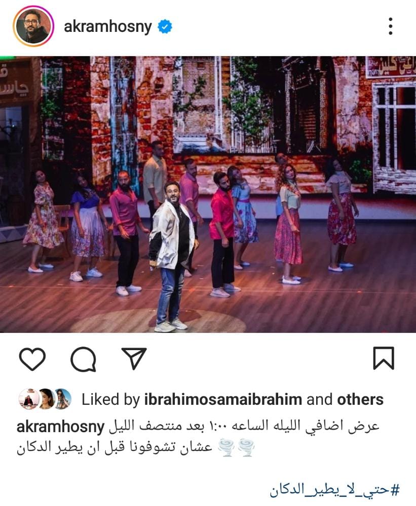 شارك أكرم حسني صورة جديدة له من كواليس عرض مسرحية حتى لا يطير الدكان، وعلق عليها، قائلًا: “عرض إضافي الليلة الساعة ١:٠٠ بعد منتصف الليل عشان تشوفونا قبل أن يطير الدكان”.
