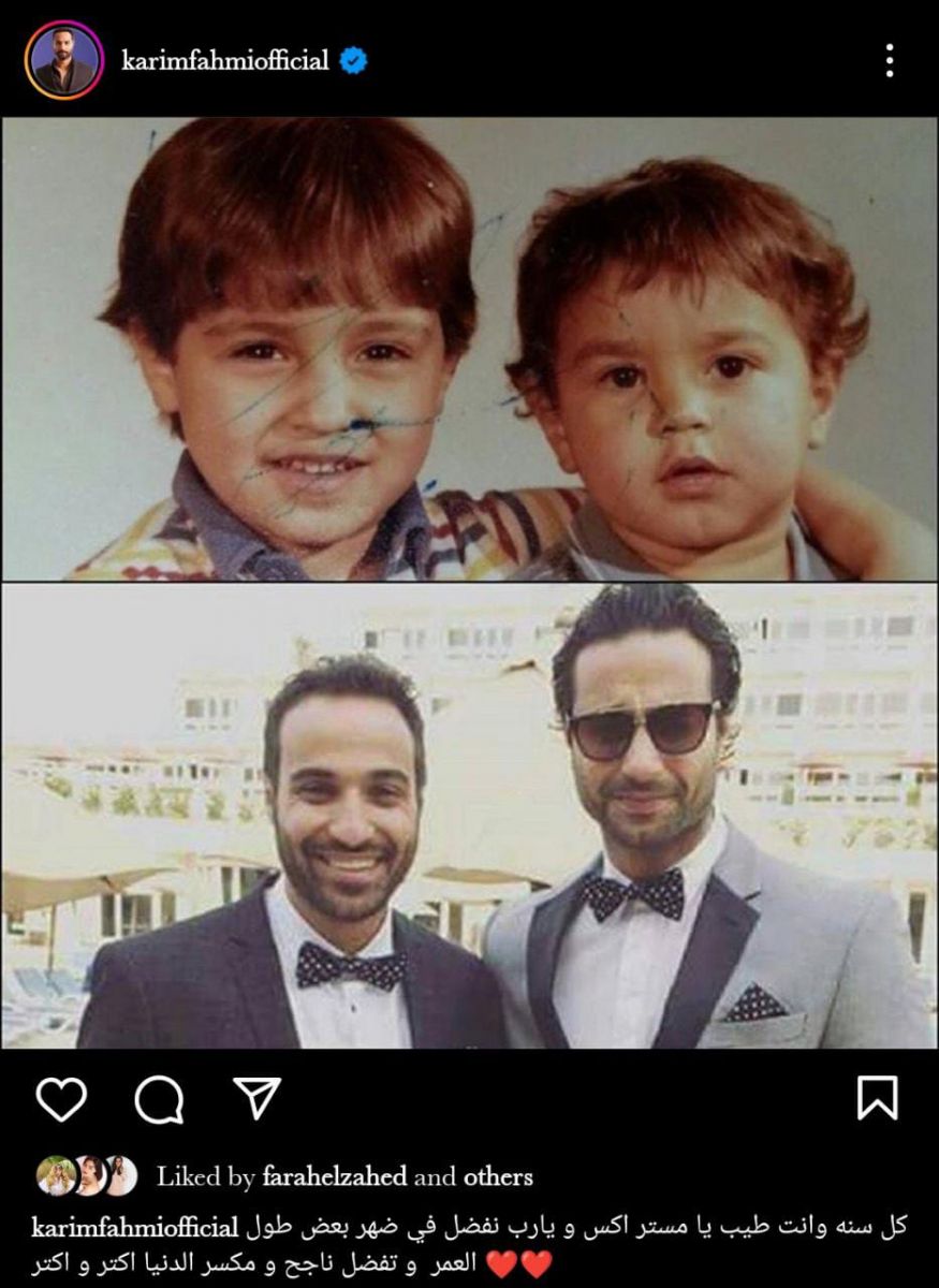 هنأ "كريم" شقيقه الفنان أحمد فهمي بعيد ميلاده، معلقًا: "كل سنة وانت طيب يا مستر اكس، ويارب نفضل في ضهر بعض طول العمر وتفضل ناجح ومكسر الدنيا اكتر واكتر".