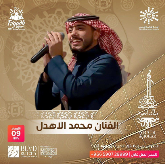 يحيي الفنان السعودي محمد الأهدل، ليلة غنائية في المملكة العربية السعودية، وذلك ضمن فعاليات موسم الرياض 2022، فوق الخيال برعاية الهيئة العامة للترفيه، الذي يضم عددًا كبيرًا من نجوم الغناء العربي والخليجي.