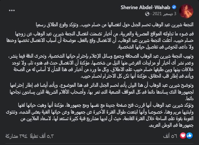 في 3 ديسمبر 2021.. أعلنت الفنانة المصرية شيرين عبدالوهاب انفصالها رسميًا عن حسام حبيب عبر حسابها الرسمي على الفيس بوك.