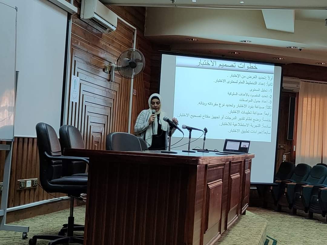 وتناولت الدورة التدريبية الموضوعات المهمة الخاصة بكيفية اعداد جدول المواصفات والوزن النسبي للموضوعات والأهداف السلوكية للمقررات وكيفية تقييم الورقة الامتحانية.