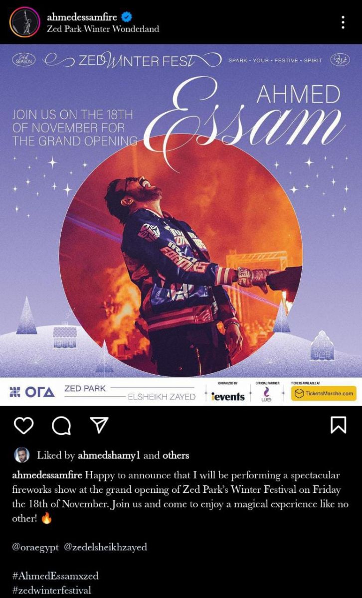 وعلق "عصام"، على الصورة قائلًا: "يسعدني أن أعلن أنني سأقدم عرضًا رائعًا للألعاب النارية في الافتتاح الكبير لمهرجان الشتاء في زيد بارك، يوم الجمعة 18 نوفمبر، انضم إلينا للاستمتاع بتجربة سحرية لا مثيل لها".