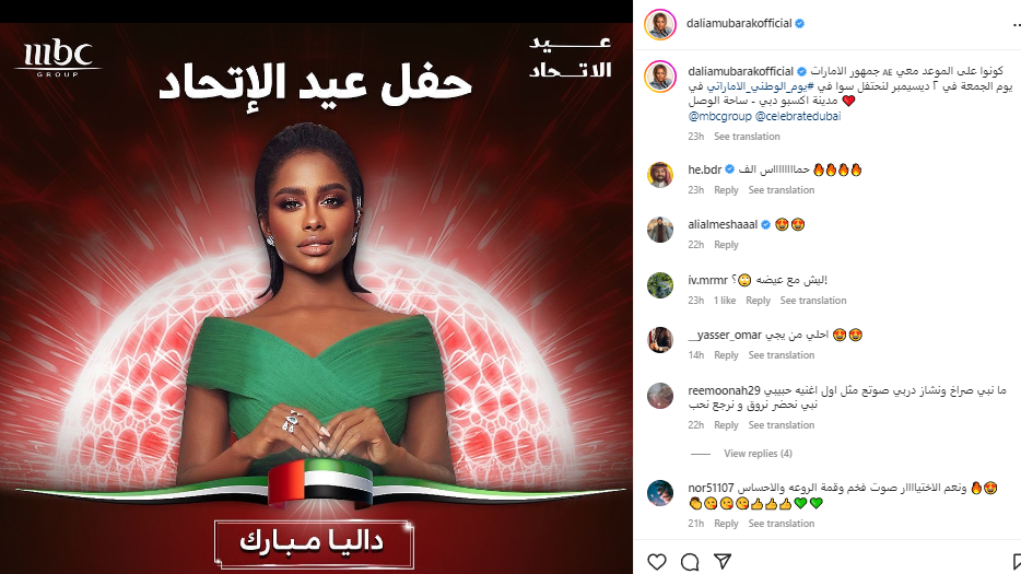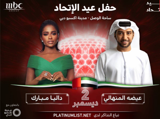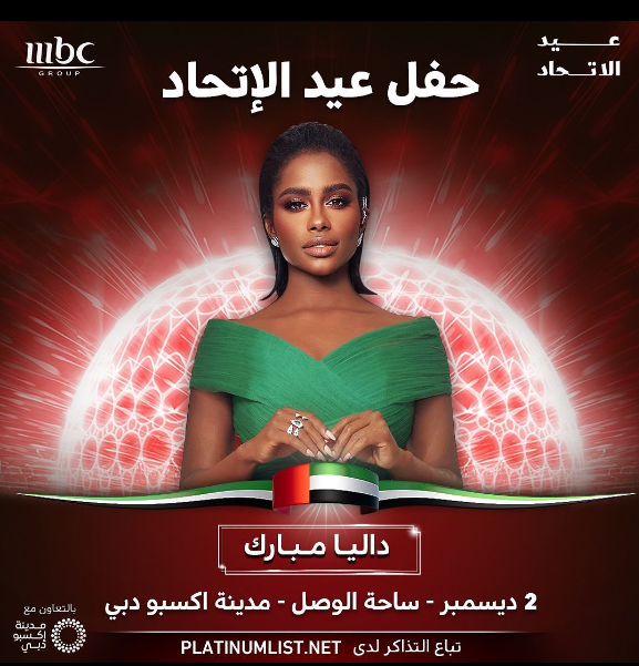 تستعد الفنانة السعودية داليا مبارك، لإحياء حفلًا غنائيًا في اكسبو دبي، بمناسبة اليوم الوطني لدولة الإمارات، رفقة الفنان عيضة المنهالي، وذلك يوم الجمعة الموافق الــــ 2 ديسمبر المقبل، ومن المقرر أن يقدم الثنائي باقة مميزة من الأغاني الوطنية والعاطفية المحببة لدى الجمهور.