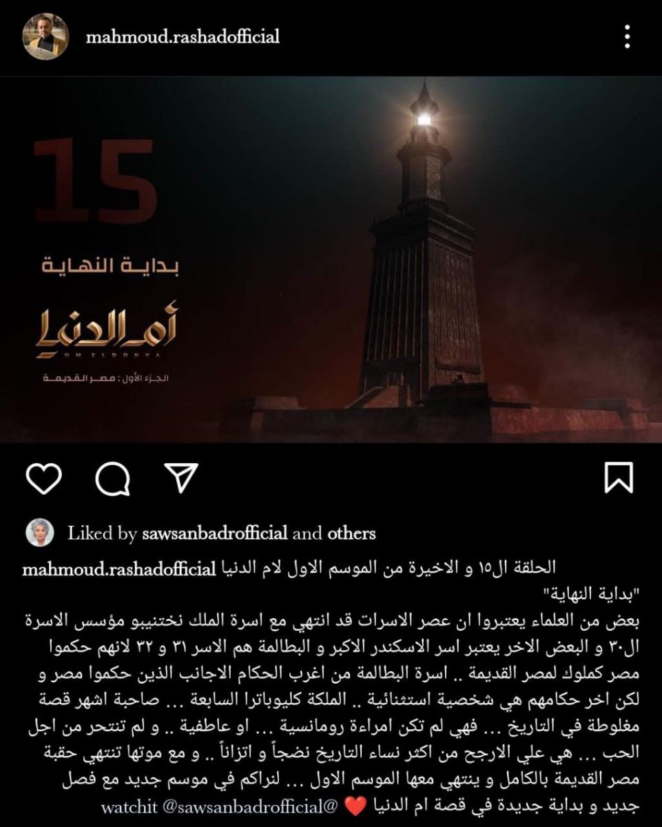 وعلق "رشاد"، على المنشور قائلًا: "الحلقة الـ 15 والأخيرة من الموسم الأول لأم الدنيا، "بداية النهاية"، بعض من العلماء يعتبروا ان عصر الاسرات قد انتهى مع أسرة الملك نختنيبو، مؤسس الأسرة الـ 30، والبعض الاخر يعتبر اسر الاسكندر الأكبر والبطالمة هم الاسرة 31 و 32، لأنهم حكموا مصر كملوك لمصر القديمة".