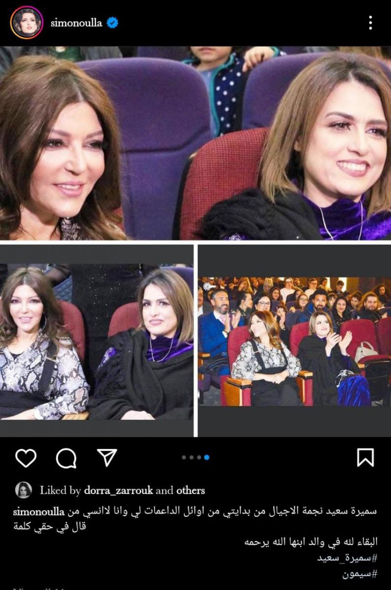 وعلقت "سيمون"، على المنشور قائلة: "سميرة سعيد نجمة الأجيال، من بدايتي من أوائل الداعمات لي، وأنا لا أنسي من قال في حقي كلمة، البقاء لله في والد ابنها، الله يرحمه".