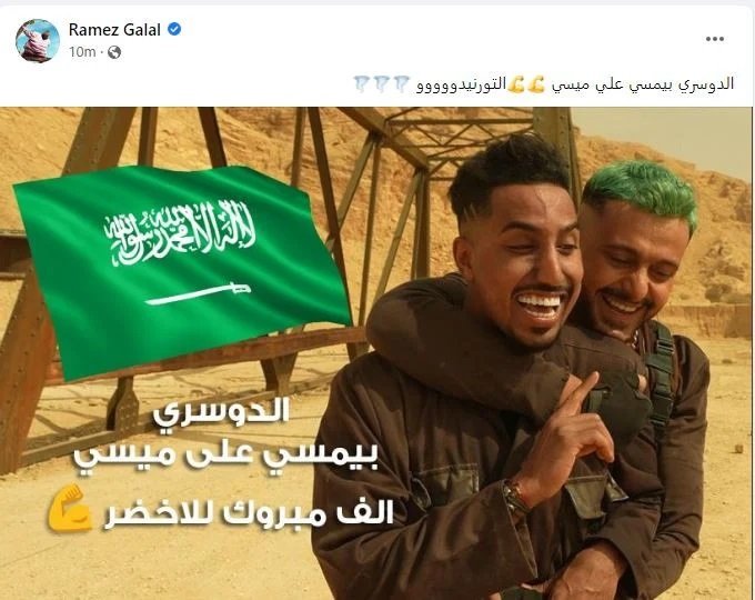 ونشر رامز جلال صورة تجمعه مع اللاعب السعودي سالم الدوسري وذلك عبر حسابه الرسمي بموقع فيسبوك، وعلق عليها قائلا: "الدوسري بيمسي على ميسي.. ألف مبروك للأخضر.. التورنيدووووو".