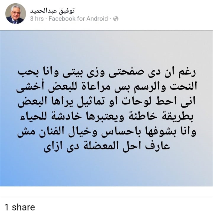 وكتب "عبد الحميد": "رغم أن دى صفحتى وزى بيتى، وأنا بحب النحت والرسم، بس مراعاة للبعض أخشى إنى احط لوحات او تماثيل يراها البعض بطريقة خاطئة ويعتبرها خادشة للحياء"، متابعاً: "أنا بشوفها باحساس وخيال الفنان، مش عارف أحل المعضلة دى إزاى".