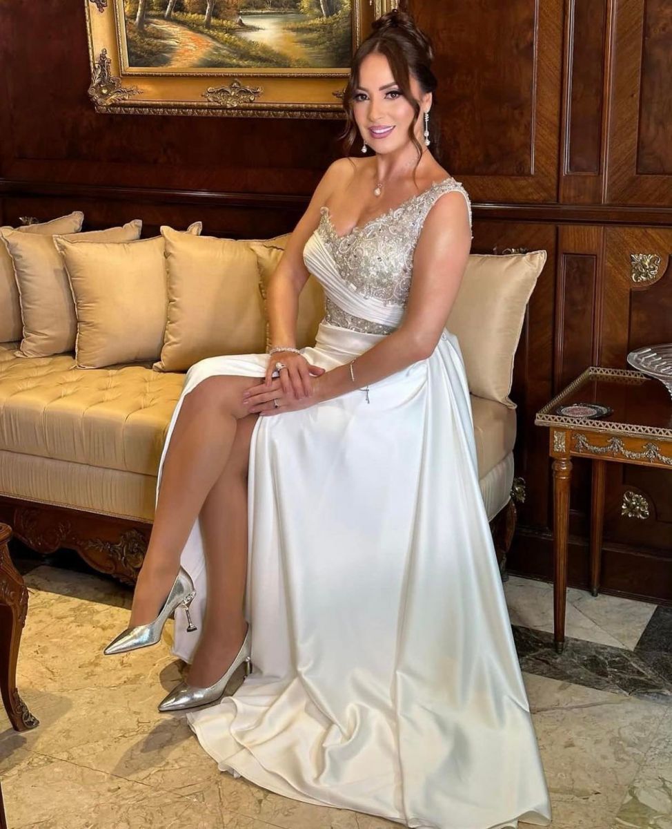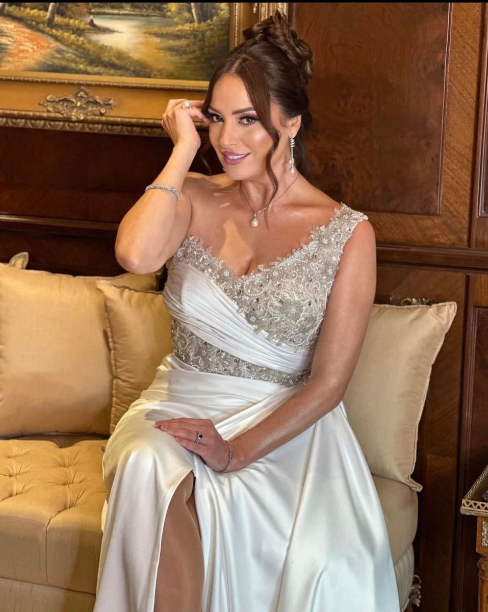 وبدت نرمين بفستان أبيض بصيحة الكتف الواحد، ومكشوف من الصدر وأحد الساقين، ومليء بالتطريزات المصنوعة من الخرز الأبيض الشفاف، مما أبرز أناقتها وجمالها.