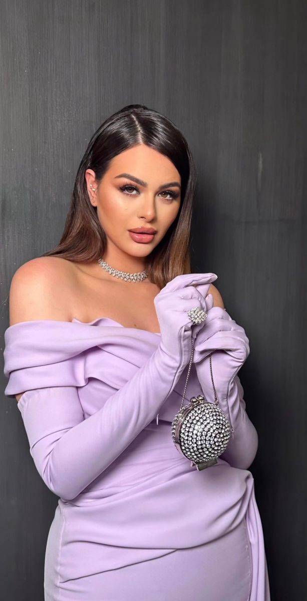 ونسقت مع الفستان قفازات طويلة نفس اللون، وتزينت بخاتم كبير الحجم ومرصع بالألماس، وعقد ملتف حول رقبتها وأقراط رقيقة مثبته في الأذن، وحملت حقيبة صغيرة الحجم مطرزة بالفصوص الكريستالية.