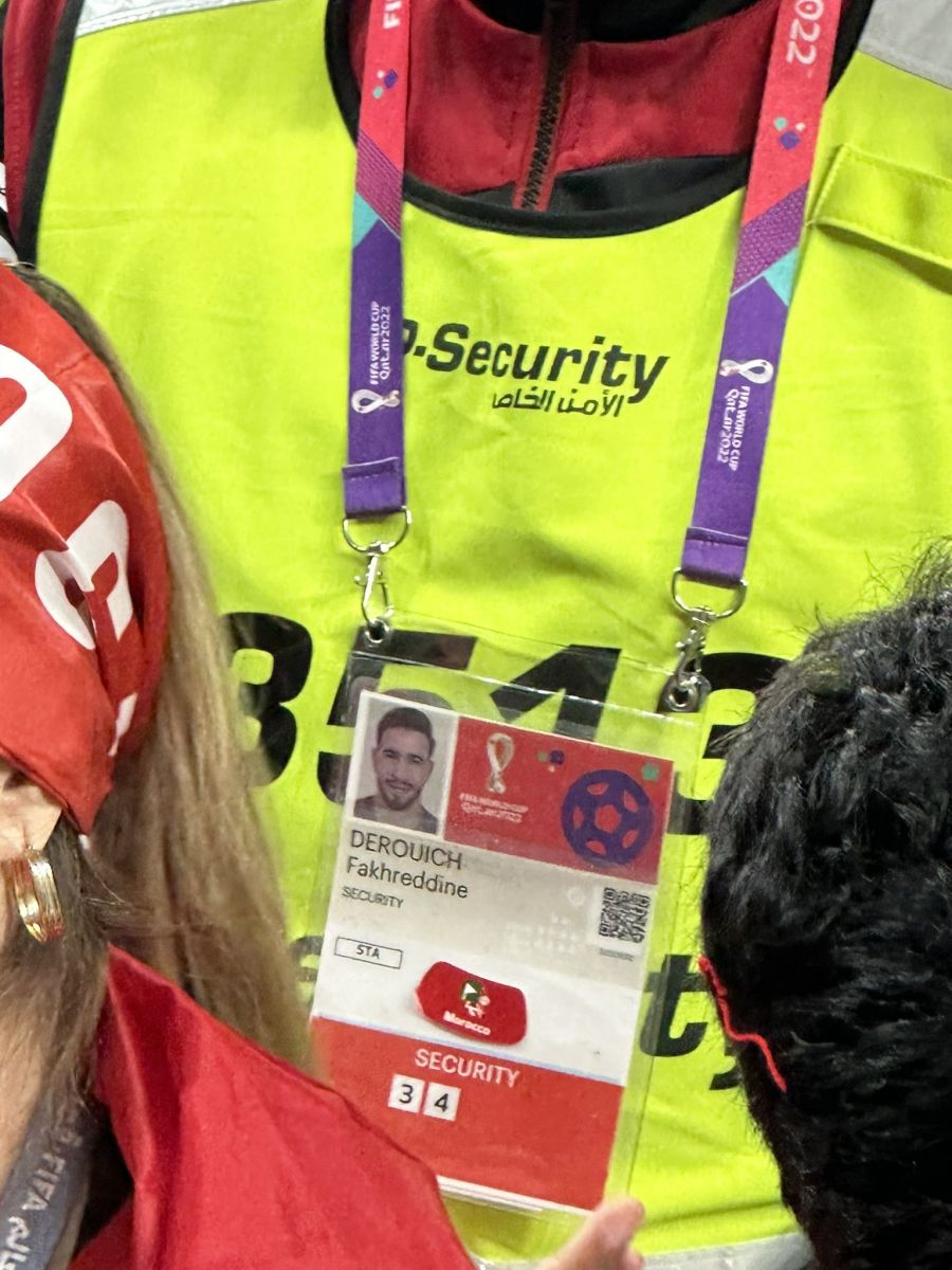 وظهر حارس الأمن المغربي ويدعى " فخر الدين درويش " في لقطة مؤثرة، لم يتمالك نفسه في الملعب خلال مباراة المغرب وإسبانيا، بعدما علم أن منتخب بلاده انتصر في المباراة المحتدمة.