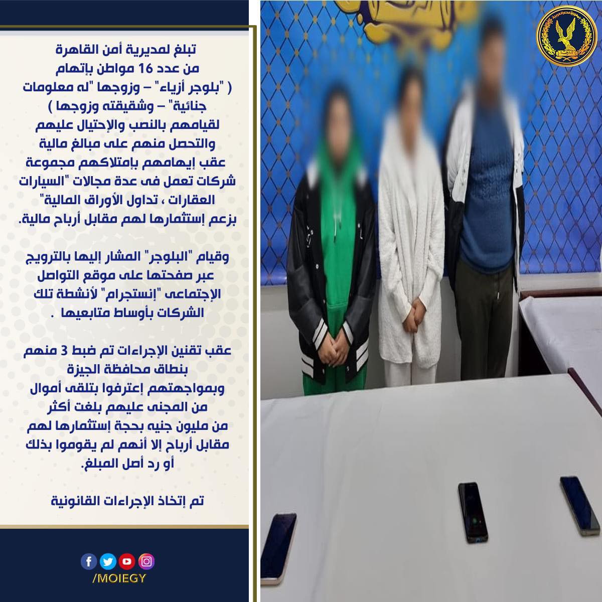 وأضاف: "وقيام "البلوجر" المشار إليها بالترويج عبر صفحتها على موقع التواصل الاجتماعى "إنستجرام" لأنشطة تلك الشركات بأوساط متابعيها.. عقب تقنين الإجراءات تم ضبط 3 منهم بنطاق محافظة الجيزة.. وبمواجهتهم اعترفوا بتلقى أموال من المجنى عليهم بلغت أكثر من مليون جنيه بحجة استثمارها لهم مقابل أرباح إلا أنهم لم يقوموا بذلك أو رد أصل المبلغ"، متابعًا: "تم اتخاذ الإجراءات القانونية.. وجارٍ تكثيف الجهود لضبط المتهم الهارب".