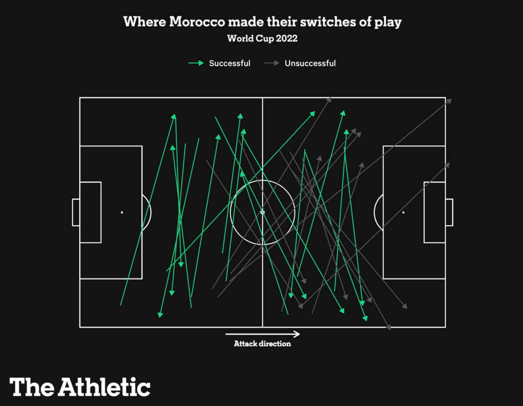 وتوضح الصورة التالية من موقع "The Athletic" الإنجليزي قدرة منتخب أسود الأطلس على إرسال التمريرات العكسية من جهة إلى أخرى.
