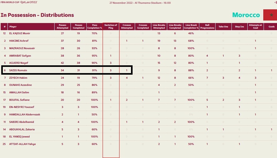 وبالنظر إلى إحصائيات الموقع الرسمي للفيفا من مباريات المغرب في كأس العالم 2022 فإن المدافع الأيسر رومان سايس يتميز بإرسال التمريرات العكسية أو ما تسمى بتمريرات الــ" Switching of play".