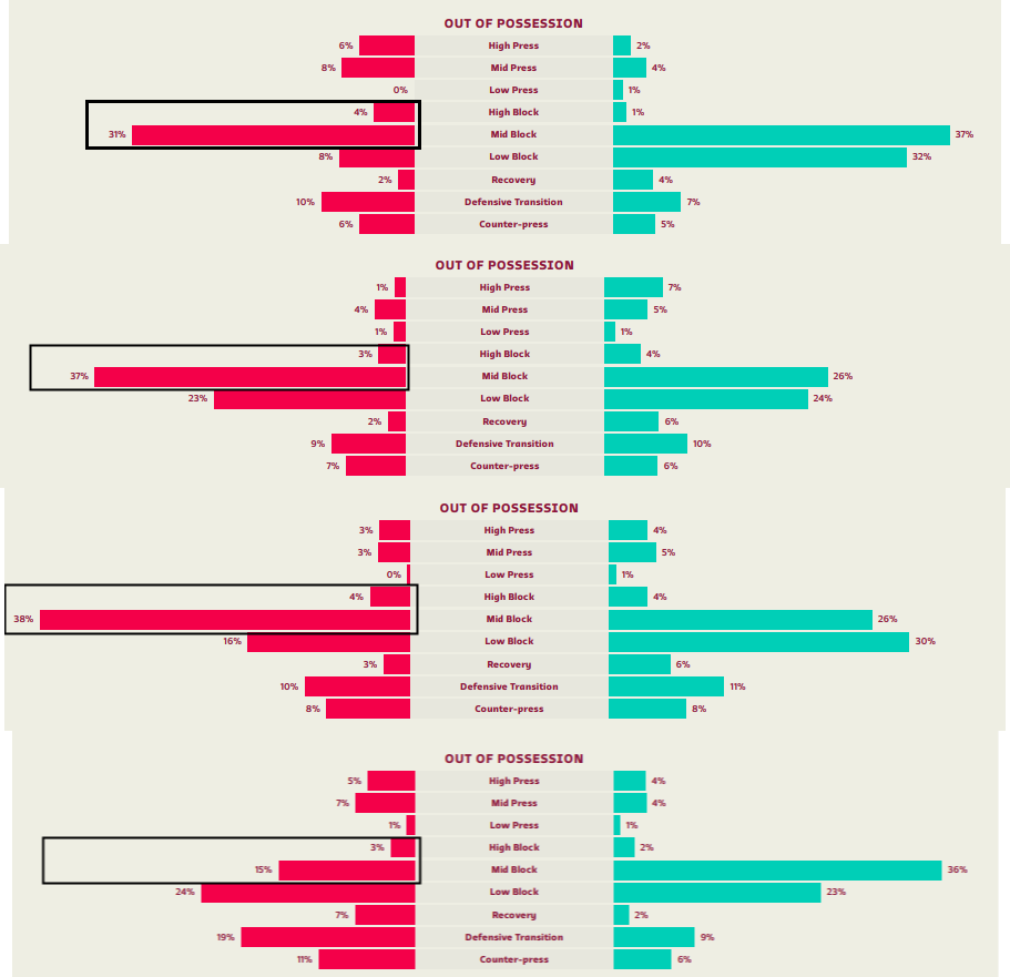 وتوضح الصورة التالية نسبة بقاء منتخب فرنسا في كل حالة من حالات الدفاع المختلفة خلال 4 مباريات له بمونديال قطر حيث يميل أكثر للبقاء في حالة الضغط المتوسط " Mid block" مع تواجده بنسبة أقل للغاية في حالة الضغط العالي " High block".