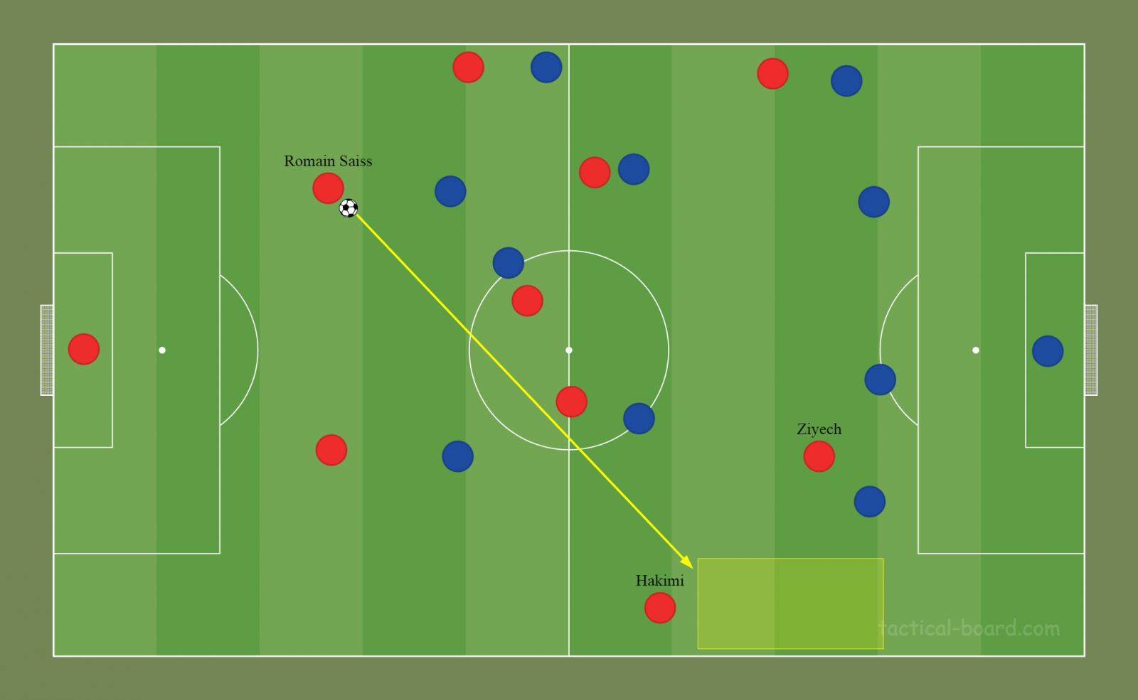 وذلك عن طريق إرسال التمريرات العكسية من رومان سايس من الطرف الأيسر إلى الأيمن مع تحرك الظهير أشرف حكيمي في المساحات واستغلال سرعته بالكرة وبدونها.