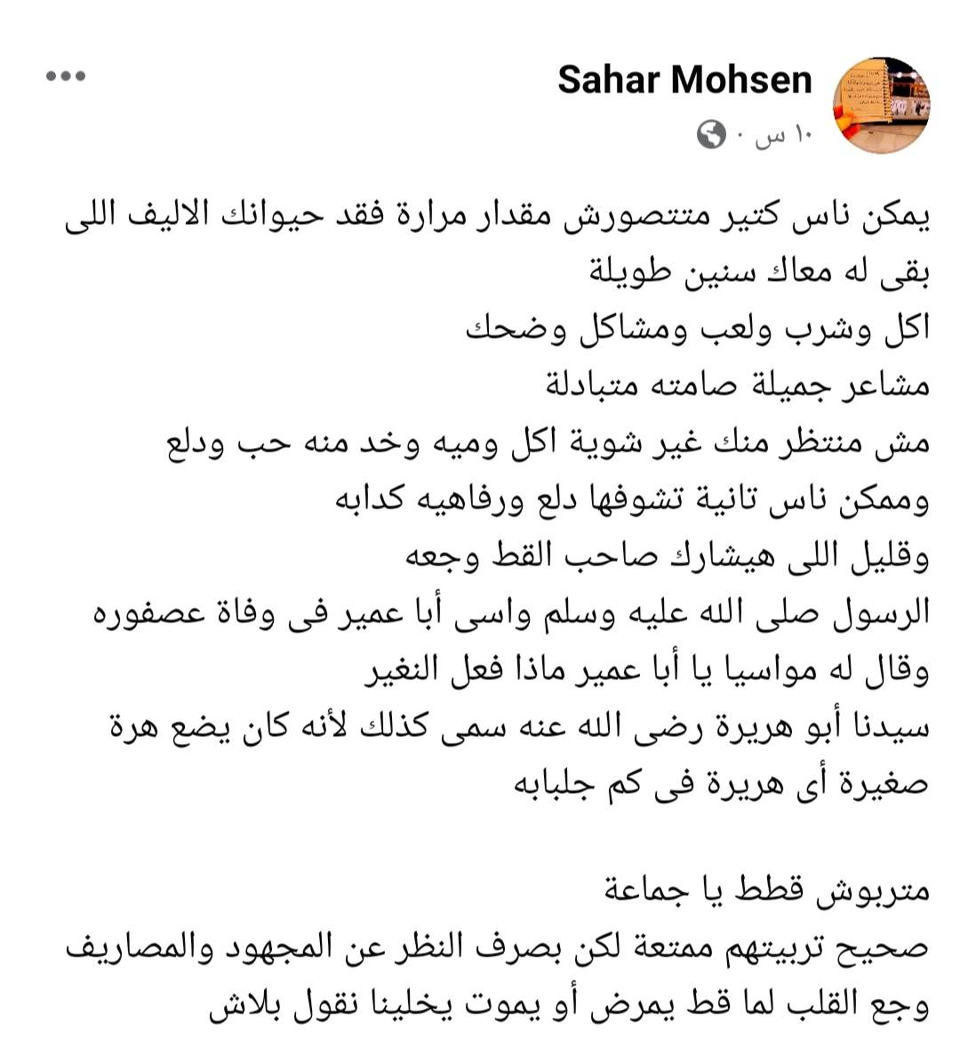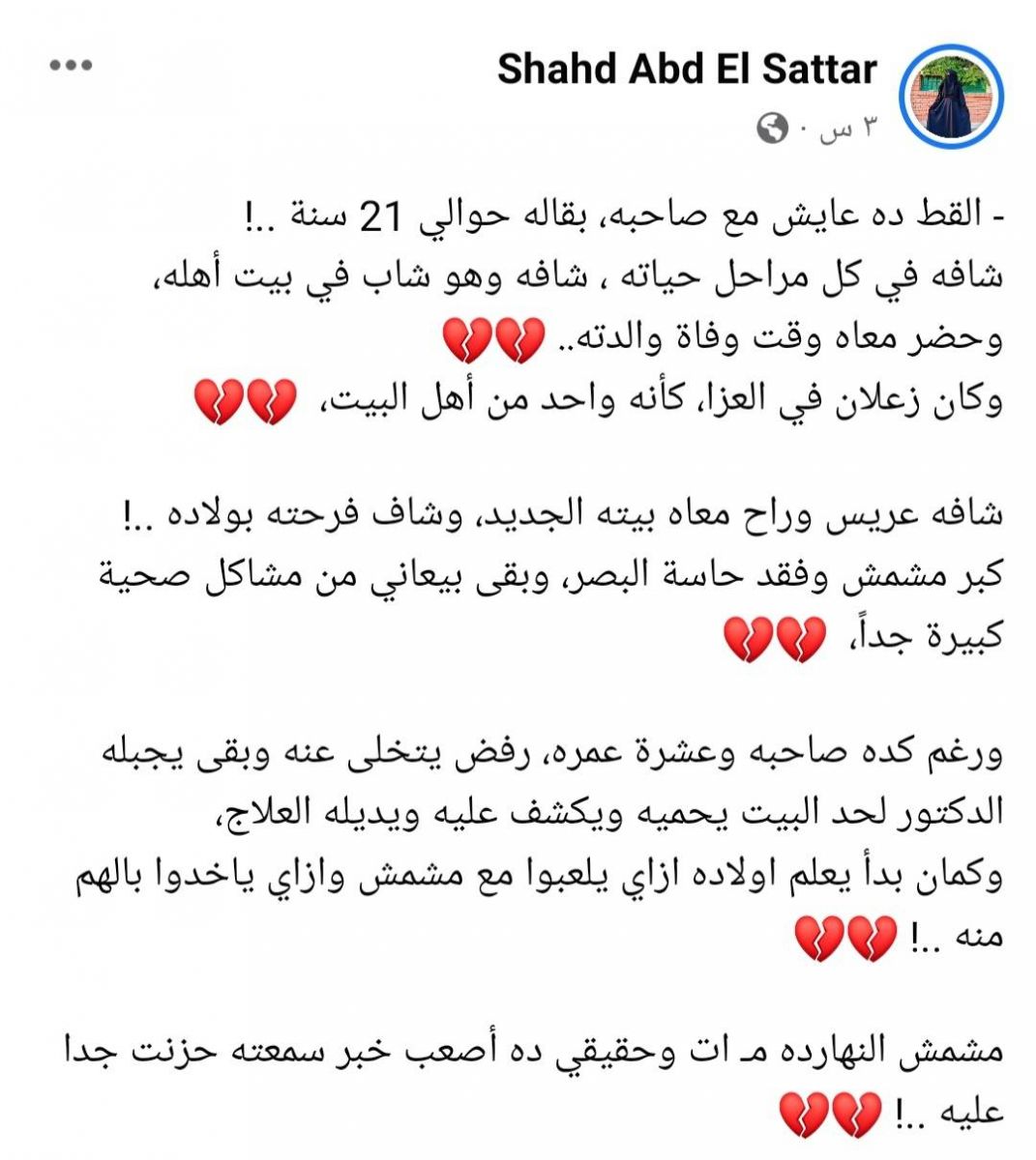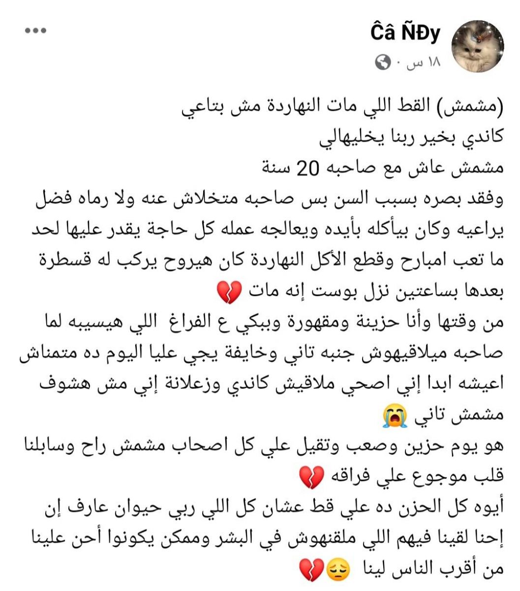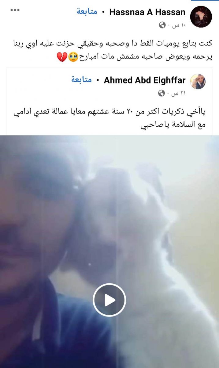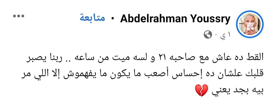 وودعه صاحبه عبر حسابه بكلمات مؤثرة قائلًا: "أنا عارف أنك هتشهدلي عند ربنا وهتقوله إني أكرمتك لآخر يوم وحتى لما كبرت وعجزت، ولما كانوا عاوزني أديك حقنة الرحمة وأنا رفضت وقولت لهم أنا اللي بخدمك وأنا راضي ولو عشت 20 سنة كمان والله كنت هفضل أخدمك بس ربنا اختار أنه يريحك".