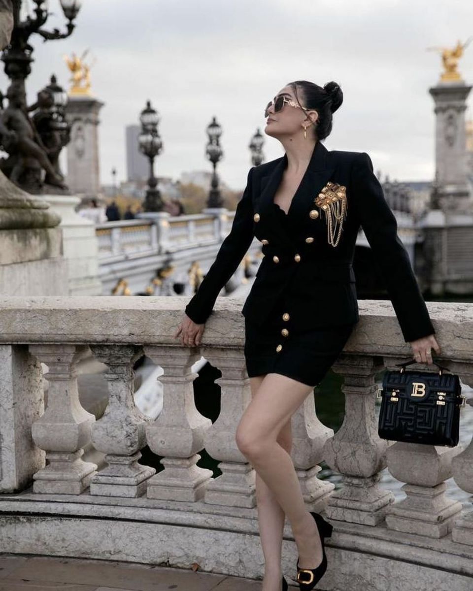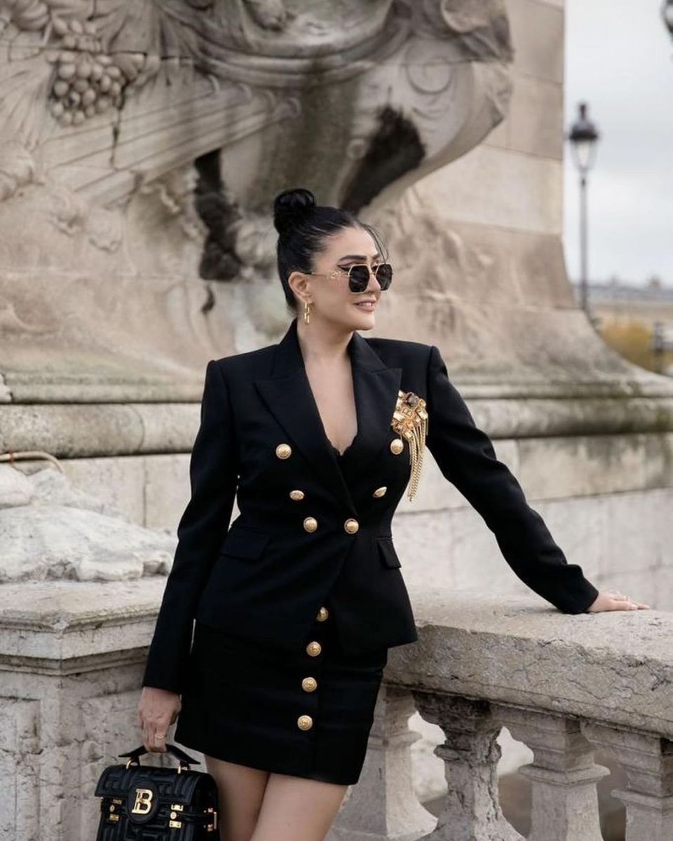 وتألقت غادة بإطلالة مثيرة ولافتة للأنظار، باللون الأسود، إذ ارتدت فستانًا فخمًا قصيرًا أعلى الركبة وذا أكمام طويلة، ومزودًا بتطريزات وأزرار ذهبية أنيقة، مما أبرز أنوثتها الطاغية ورشاقة قوامها الممشوق.