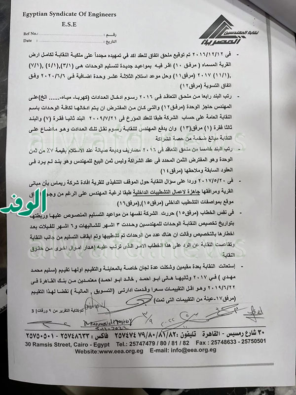 ومع ذلك لم تعترض النقابة لمخالفة الاتفاقات والاشتراطات المتفق عليها وفى ذات الخطاب حررت الشركة نفسها من مواعيد التسليم المنصوص عليها وربطتها بتواريخ تخصيص النقابة العامة للوحدات للحاجزين من المهندسين وحددت 3 أشهر للشاليهات و6 شهور للفيلات بعد إخطارها بالتخصيص وأقرت أن هناك عددًا من الوحدات تم تشطيبها وتم إيقاف التسليم من النقابة، وتقاعست النقابة عن الرد على هذا الخطاب الأمر الذى ترتب عليه إهدار أموال أخرى من حقوق النقابة.