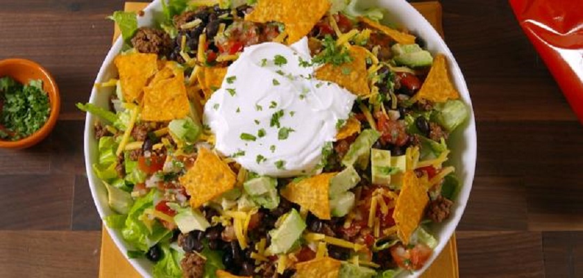زيني بجبن الشيدر، وشيبس دوريتوس المكسيكي، والكزبرة الخضراء، وقدمي السلطة فورا.