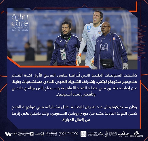 تحت إشراف الشريك الطبي لنادي الفيحاء مستشفيات رعاية، الفحوصات الطبية تؤكد اصابة حارس الفريق الأول فلاديمير ستويكوفيتش بتمزق في عضلة الفخذ الأمامية، وحاجته لبرنامج علاجي وتأهيلي لمدة أسبوعين.