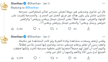 واختتمت: "قلبي إرتجف وسعدت بمشاهدة ولادة التجربة ولو كانت المشاهدة غير مكتملة، وافقت من دون أي تفكير ويعلم صديقي مدحت وشاعري إنها ليست عادتي إطلاقًا واليوم أحب أن أقول لهم جميعًا أسعدتوا قلبي بخطوة مسرحية تأخرت ولكنها تحققت، الجميع أبدع من دون الأنا والأهم والمهم أن الكل في واحد.