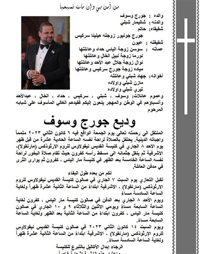 بدأ التعازي، مساء أمس السبت في كنيسة القديس نيقولاوس للروم الأرثوذكس (مار نقولا) في الأشرفية من الساعة 12 إلى 6 مساء.