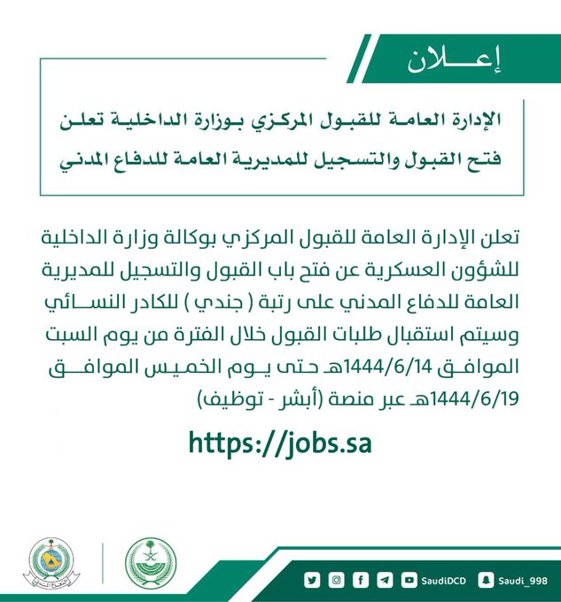 وكانت الإدارة نشرت منذ أيام قليلة عبر موقعها الإلكتروني فتح باب القبول والتسجيل للمديرية العامة للدفاع المدني برتبة (جندي-نساء) موضحة أن التقديم على وظائفها يكون بشكل إلكتروني عبر منصة "أبشر للتوظيف"، وفق شروط محددة منها: